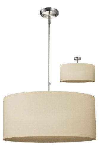 171-24C-C Size: 10" H x 24" W Features: -Pendant.-Material: Metal / Fabric.-Drum shade pendant is suited to medium to large areas and would be ideal for a dining area or to light other rooms, hall or entry.-Telescoping Rod: 18'' - 36'' or 4.5'' rod. Color/Finish: -Off White / Brushed Nickel finish.-Add a modern accent to your room with the Albion family.-Medium / large pendant drum shade is covered in a finely textured off white linen fabric with a finished edge trim detail and a removable diffuser to soften the light. Specifications: -Accommodates: 3 x 60W medium base incandescent bulbs.-Accommodates: 3 x 100W medium base incandescent bulbs. Dimensions: -Overall dimensions: 8'' H x 16'' W.-Overall dimensions, 171-24C-C: 10'' H x 24'' W.-Overall dimensions, 171-20C-C: 9'' H x 20'' W. Collection: -Albion Collection.